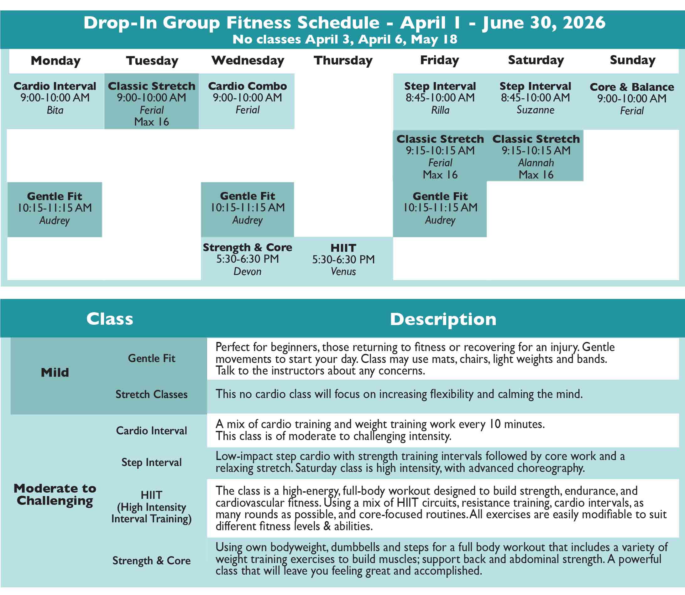 Get in shape, stay active, and improve your health with group fitness classes. Step Aerobics, and Stretch Classes, as well as Gentle Fit, Cardio Interval, and Total Body Conditioning, you’ll find a wide variety of classes to get your heart pumping. Registration not required.